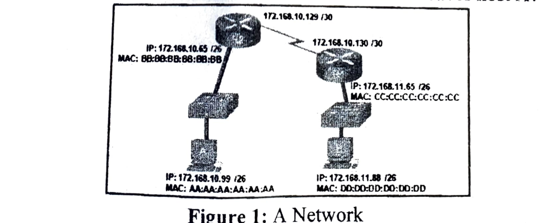 3. Refer to the Figure 1. If host A sends an IP packet to host B, what will the destination address be in the frame when it leaves host A?