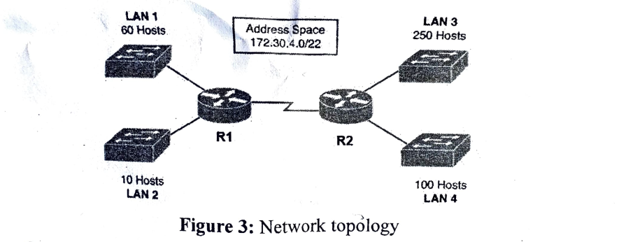 b. Subnet the network topology using 172.30.4.0/22 space. Provide answer in table format.
